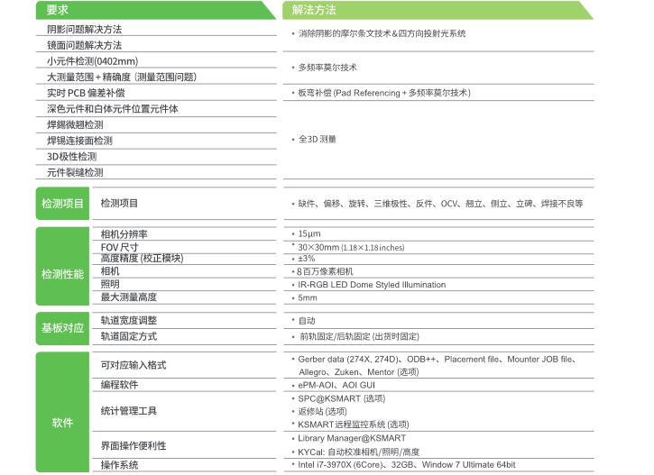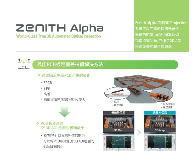 KOH YOUNG Zenith Alpha 3D AOI 利用Koh Young人工智能專利技術提高3D檢測性能 可適用于復雜產(chǎn)線的高速檢測 性價比好的設備 可檢測高元器件(Alpha HS+) 基于人工智能技術的3D幾何自動編程(KAP) KSMART 解決方案:基于全3D檢測的監(jiān)控系統(tǒng)