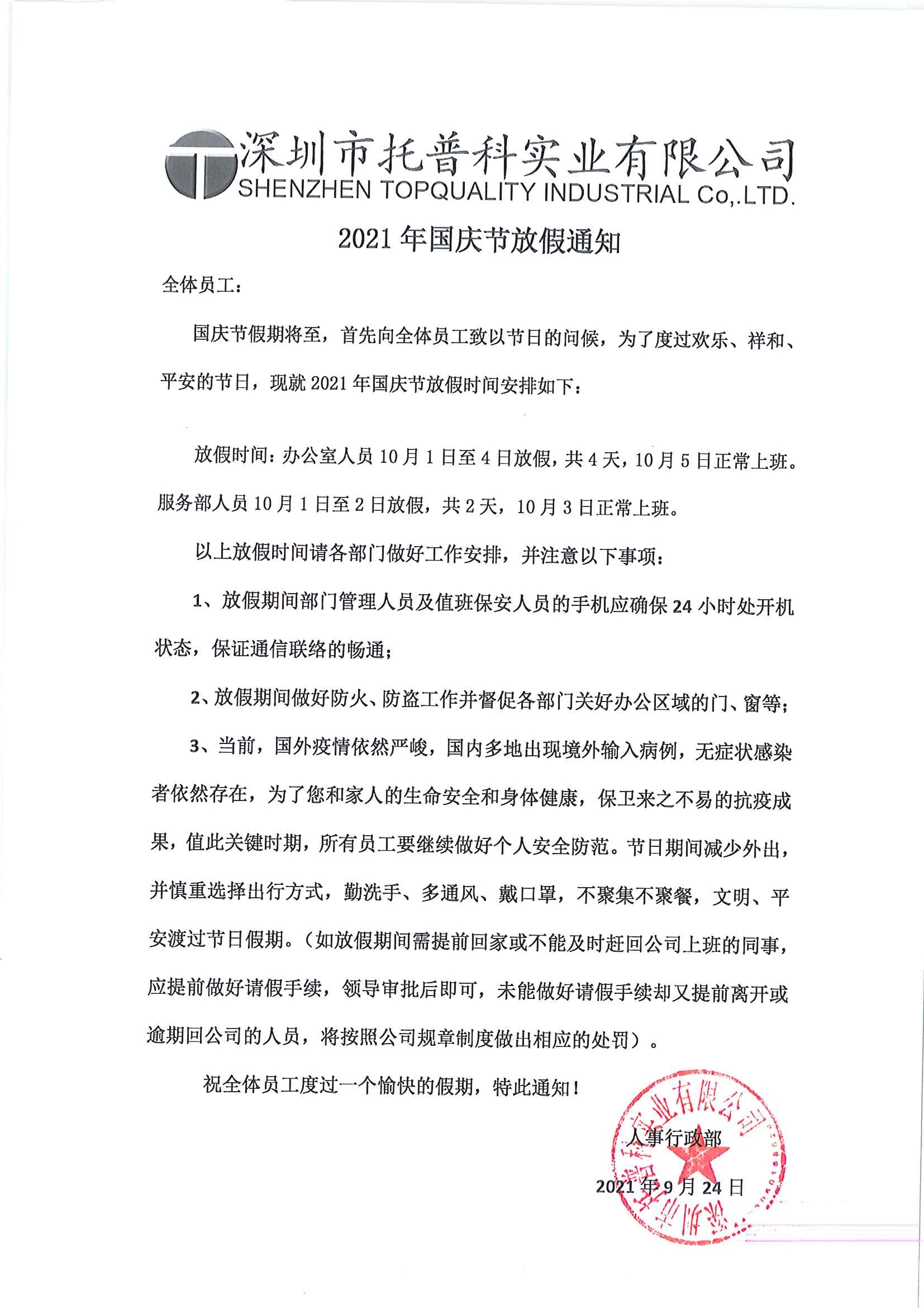 根據國務院及公司生產安排,現公布深圳托普科2021國慶節放假通知安排