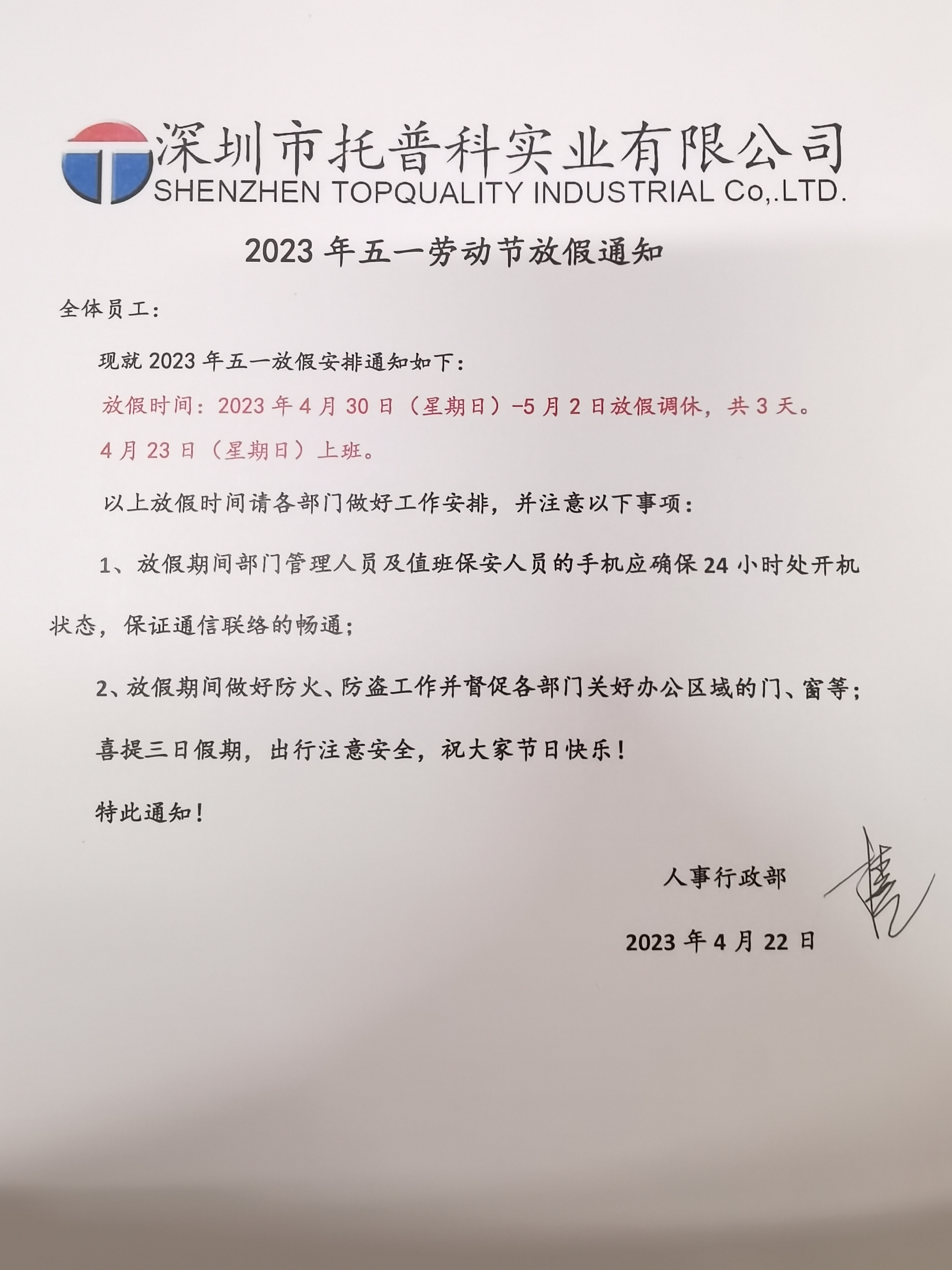 2023年五一勞動(dòng)節(jié)即將臨近,根據(jù)公司實(shí)際生產(chǎn)經(jīng)營情況以及國家有關(guān)五一勞動(dòng)節(jié)放假安排,現(xiàn)公布2023年深圳托普科實(shí)業(yè)五一勞動(dòng)節(jié)放假通知: